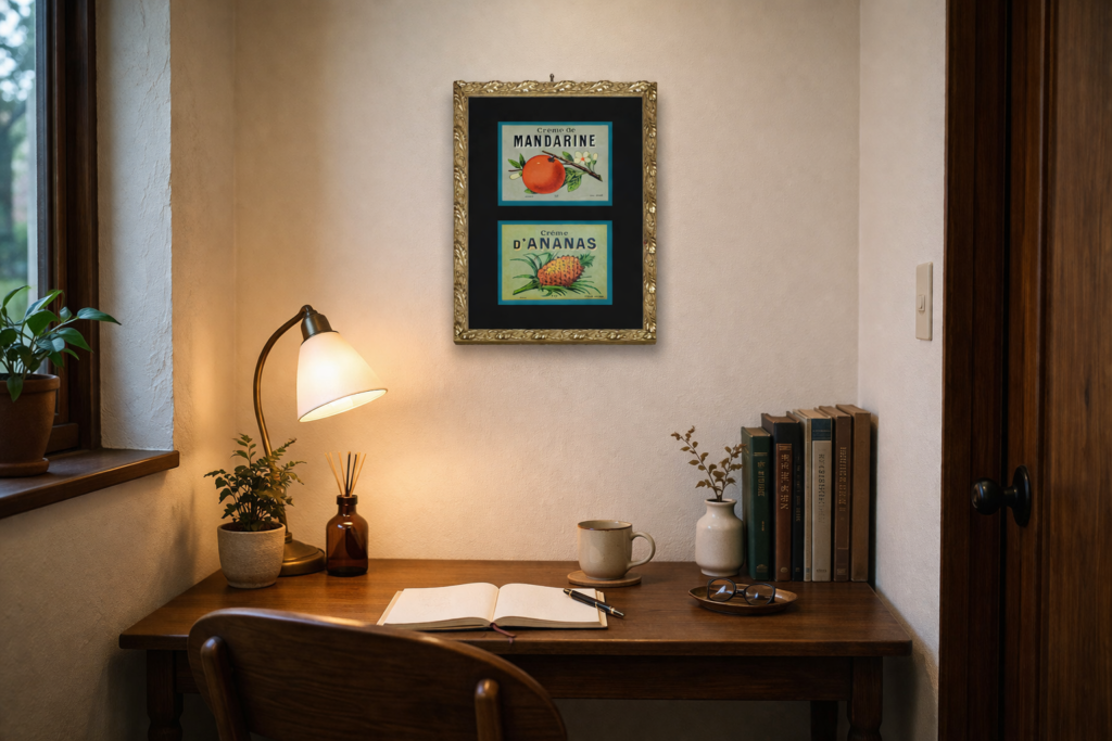 具体例として、Artstylicで取り扱っているヴィンテージ洋酒ラベルを用いたアート作品をもとに見ていきます。
