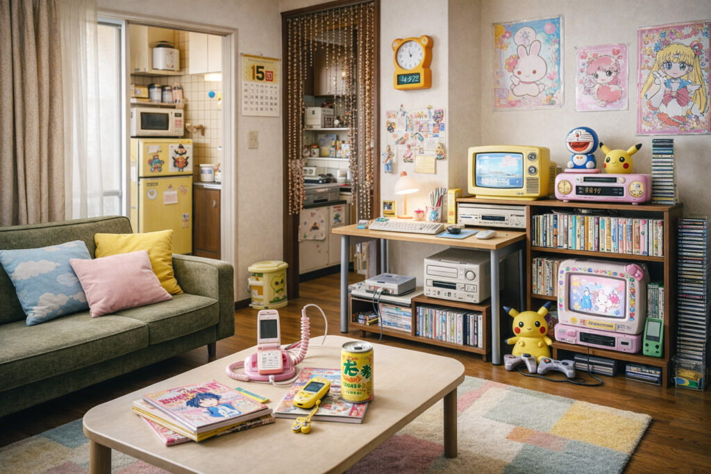 たまごっち、ガラケー、初期インターネット、ポップでカラフルな雑貨などが代表例です。